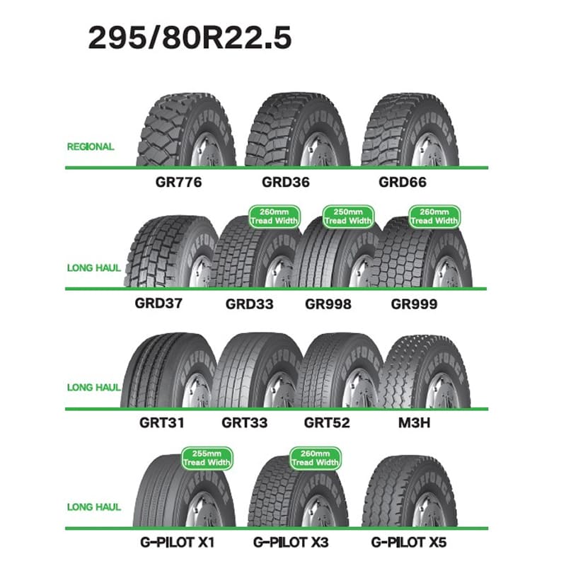 Las nervaduras reforzadas en los hombros y las ranuras entre los bloques de la banda de rodadura mejoran la resistencia al desgarro y promueven un desgaste uniforme.